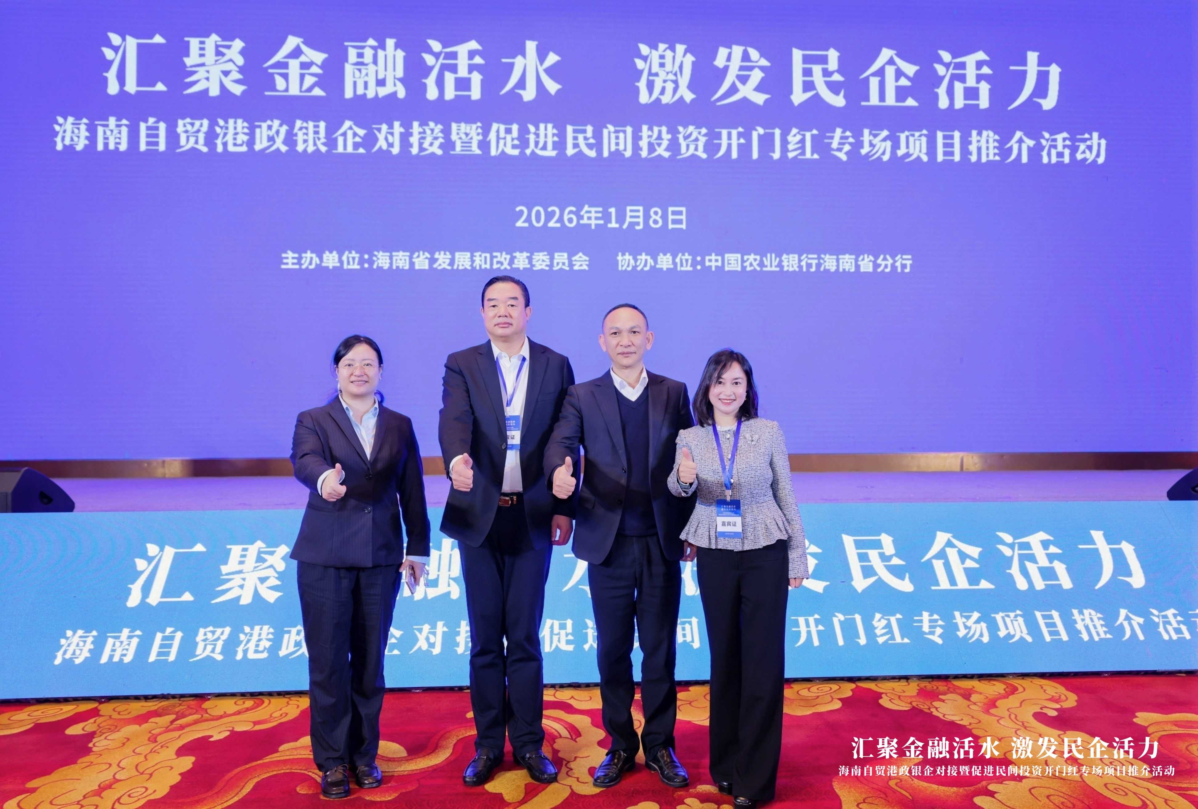 为深入贯彻落实国家及海南省关于扩大有效投资、激发民间投资活力的决策部署,搭建民间投资项目与金融资源的精准对接平台,2026年1月8日,由海南省发展和改革委员会主办的“汇聚金融活水 激发民企活力”——海南自贸港政银企对接暨促进民间投资开门红专场项目推介活动”在海口隆重举行。本次活动旨在搭建政银企精准对接平台,畅通融资渠道,激发企业活力。公司总经理颜利、副总经理兼财务总监吴燕受邀参加了本次活动。